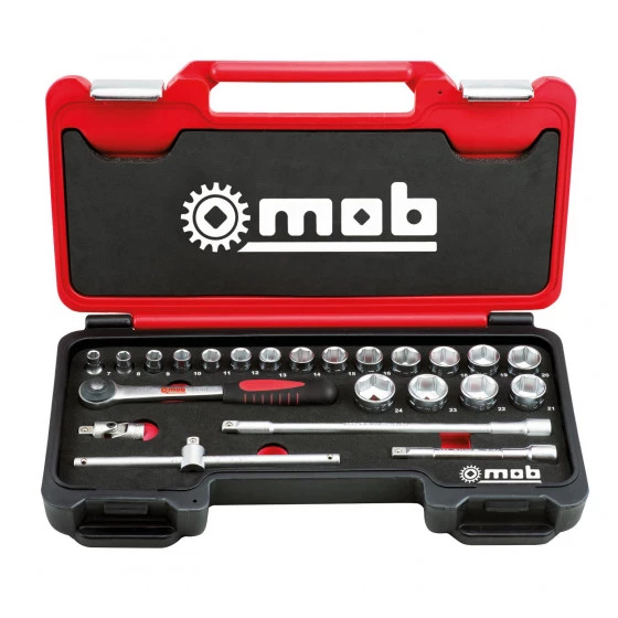18 douilles : 7-8-9-1-11-12-13-14-15-16-17-18-19-2-21-22-23-24 mm // 1 cliquet // 1 cardan // 1 poignée coulissante // 2 rallonges de 125 et 25 mm – CLIQUET PREMIUM : Verrouillage et déverrouillage rapides des douilles par bouton poussoir. Les douilles ou les accessoires ne se désolidarisent pas du cliquet. L’angle de rotation de 5° (cliquet à 72 dents) assure une reprise très performante dans des espaces réduits. Les têtes des cliquets ont un encombrement réduit pour offrir l’accessibilité maximale. Tête ronde : le changement du sens de serrage se réalise facilement avec le pouce sur toute la circonférence de la tête – DOUILLES : La suppression des angles vifs des carrés augmente leur résistance et protège les écrous contre le matage. La manipulation des douilles est rendue facile grâce à un épaulement extérieur prévu pour la prise. Marquage de la dimension sur tout le pourtour.