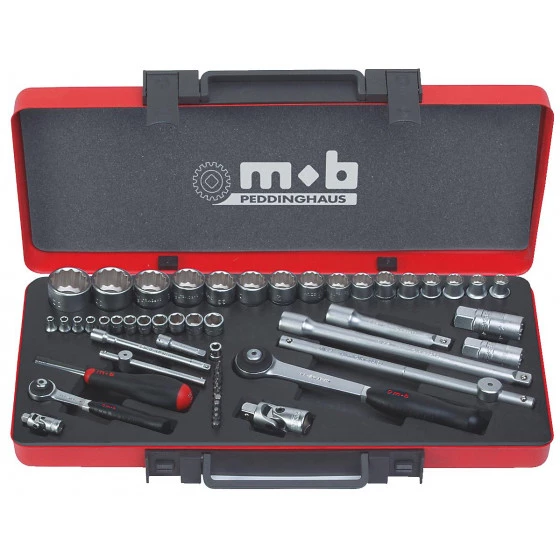Carré 1/4’’ : 12 douilles 6 pans : 4-4,5-5-5,5-6-7-8-9-1-11-12-13 mm // 1 cliquet Premium rond // 1 cardan // 1 poignée coulissante // 2 rallonges : 5 et 125 mm // 1 poignée emmanchée // 1 douilles porte-embouts // 1 embouts de vissage : 2 fentes : ,6×4 – 1×5,5 – 2 Pozidrivs : PZ1-PZ2 – 4 hexagonaux : H3-H4-H5-H6 – 2 Torx : T3-T4 // Carré 1/2’’ : 16 douilles 12 pans : 1/11/12/13/14/15/16/17/19/21/22/23/24/27/3/32 mm // 2 douilles à bougie 16 et 21 mm // 1 cliquet Premium rond // 1 cardan // 2 rallonges : 125 et 25 mm // 1 poignée coulissante