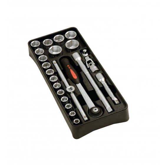17 douilles de 1-11-12-13-14-15-16-17-18-19-2-21-22-24-27-3-32 mm – 1 cliquet – 2 rallonges : 125 mm + 25 mm – 1 poignée coulissante – 1 cardan – 1 adaptateur. Dans module thermoformé 385 x 165 mm. CLIQUET PREMIUM : Verrouillage et déverrouillage rapides des douilles par bouton poussoir. Les douilles ou les accessoires ne se désolidarisent pas du cliquet. L’angle de rotation de 5° (cliquet à 72 dents) assure une reprise très performante dans des espaces réduits. Les têtes des cliquets ont un encombrement réduit pour offrir l’accessibilité maximale. Tête ronde : le changement du sens de serrage se réalise facilement avec le pouce sur toute la circonférence de la tête. Manche confortable bimatière étudié pour travailler dans toutes les positions : polypropylène pour plus de résistance, élastomère pour une bonne prise en main (grip). Liaison corps-manche du cliquet étudiée pour ne pas gêner la main lors de la prise. DOUILLES : La suppression des angles vifs des carrés augmente leur résistance et protège les écrous contre le matage. La manipulation des douilles est rendue facile grâce à un épaulement extérieur prévu pour la prise. Marquage de la dimension sur tout le pourtour. Douilles 6 pans pour serrages puissants.